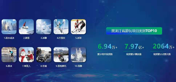 這些游客大部分選擇在冬季來到黑龍江,欣賞冰天雪地。冬季游玩項(xiàng)目是外地游客來黑龍江的源動力,2020年,黑龍江省游玩項(xiàng)目類短視頻TOP10中,潑水成冰類視頻深受用戶的喜愛,排在第一位,其次分別是:滑雪、冰雕、打雪仗、冰球、滑冰、堆雪人、冬捕、雪地摩托、雪雕等,所有游玩項(xiàng)目類視頻累計(jì)相關(guān)視頻數(shù)6.94萬+、播放量7.97億+、點(diǎn)贊次數(shù)2064萬+。