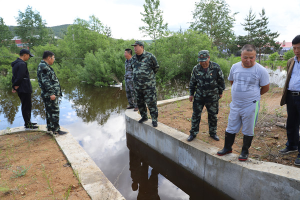 林業(yè)局黨委書(shū)記胡守慶(右四)深入汛情現(xiàn)場(chǎng),查看水位情況。