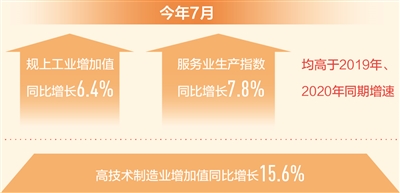 工業(yè)、服務(wù)業(yè)穩(wěn)步增長。7月,全國規(guī)模以上工業(yè)增加值同比增長6.4%,全國服務(wù)業(yè)生產(chǎn)指數(shù)同比增長7.8%,均高于2019年、2020年同期增速;中國制造業(yè)采購經(jīng)理指數(shù)為50.4%,服務(wù)業(yè)商務(wù)活動指數(shù)為52.5%,均連續(xù)17個月高于臨界點;服務(wù)業(yè)業(yè)務(wù)活動預(yù)期指數(shù)為60.1%,持續(xù)位于較高景氣區(qū)間。
