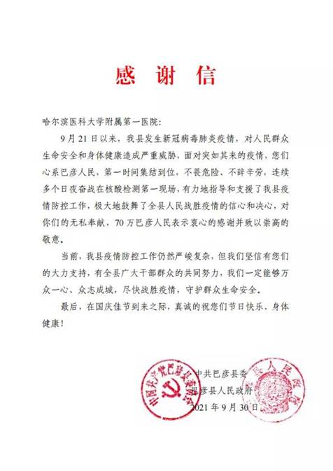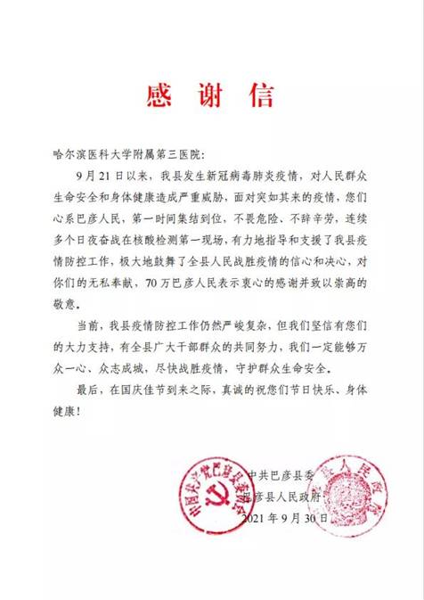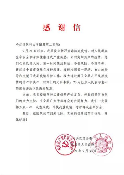 黑龍江經(jīng)濟(jì)網(wǎng)訊(黑龍江日?qǐng)?bào)全媒體見習(xí)記者董廣碩 商祺)近日,哈爾濱醫(yī)科大學(xué)附屬一院、二院、腫瘤醫(yī)院、四院分別收到巴彥縣委縣政府的感謝信,感謝他們“有力地指導(dǎo)和支援了我縣疫情防控工作,極大地鼓舞了全縣人民戰(zhàn)勝疫情的信心和決心?!?/span>