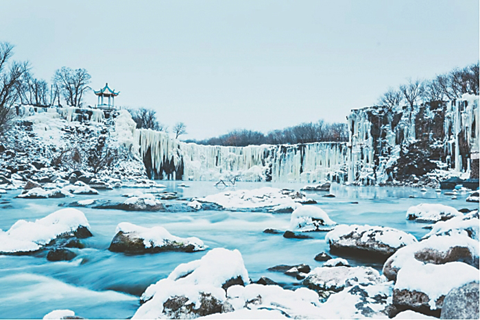 從哈爾濱向東出發(fā),來到世界最大的火山熔巖堰塞湖——鏡泊湖。夏日奔騰咆哮的吊水樓瀑布在冬季可形成厚達(dá)兩米、寬達(dá)數(shù)百米的冰瀑,似冰山聳立,是中國規(guī)模最大的冰瀑布。當(dāng)夜幕降臨,冰瀑被燈光點(diǎn)亮,銀色的冰柱以及周邊的懸崖峭壁、樹木等由遠(yuǎn)及近全部勾連起來,呈現(xiàn)出光影交織的水墨長卷。