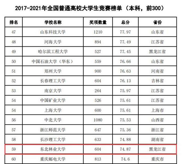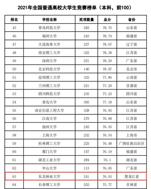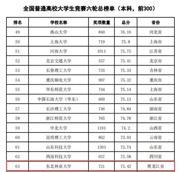 據(jù)悉,中國高等教育學(xué)會(huì)自2017年2月啟動(dòng)《高校競賽評估與管理體系研究》項(xiàng)目以來,中國高等教育學(xué)會(huì)已經(jīng)連續(xù)發(fā)布六輪榜單,這是我國第一個(gè)專注高校創(chuàng)新人才培養(yǎng)暨學(xué)科競賽成果的排行榜,是檢驗(yàn)高校人才培養(yǎng)質(zhì)量的重要途徑。為從更長的時(shí)間段了解各高校大學(xué)生競賽發(fā)展態(tài)勢,特在今年發(fā)布了“六輪總榜單”,時(shí)間跨度從2012年到2021年,東北林業(yè)大學(xué)以總分73.42,位列全國第63位。