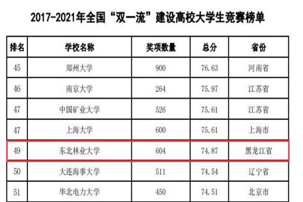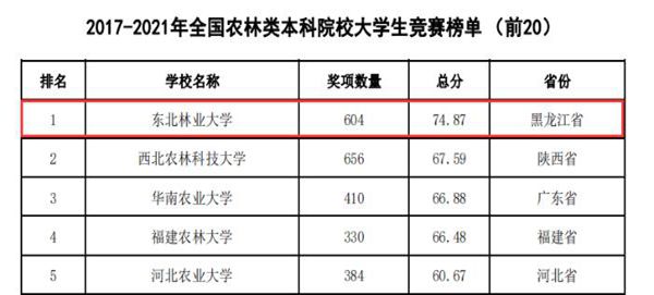 黑龍江經(jīng)濟(jì)網(wǎng)訊(黑龍江日報(bào)全媒體見習(xí)記者董廣碩 商祺)近日,中國高等教育學(xué)會(huì)高校競賽評估與管理體系研究工作組發(fā)布2021全國普通高校大學(xué)生競賽分析報(bào)告,在《2017-2021年農(nóng)林類本科院校大學(xué)生競賽排行榜TOP20》中。東北林業(yè)大學(xué)以總分74.87(獲獎(jiǎng)604項(xiàng))的優(yōu)異成績連續(xù)四年蟬聯(lián)榜首。