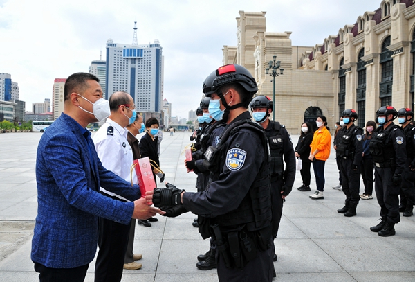 公益活動首批慰問對象是剛從抗疫一線歸來的哈爾濱市公安局巡特警支隊隊員。本次疫情期間,他們馳援五常市拉林鎮(zhèn)、哈爾濱市平房區(qū)和賓縣,先后核查車輛3700余臺,幫助群眾1100多人,為群眾配送餐食10萬余份、飲用水20余萬瓶、防疫物資9000余件,用血肉身軀筑起了抗擊疫情的鋼鐵長城,詮釋了“疫情當前,特警在先”的使命擔當?!案兄x黑龍江日報報業(yè)集團和愛心企業(yè)送來健康產(chǎn)品。今后我們會一如繼往做好本職工作,哪里需要哪里上,當好人民的忠誠衛(wèi)士?!苯舆^“小綠君”,哈爾濱市公安局巡特警支隊特警一大隊二中隊教導(dǎo)員劉甲洲一臉幸福。