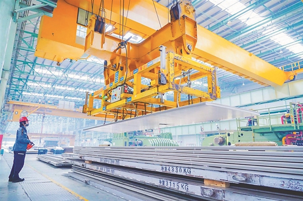 生產(chǎn)人員對(duì)軋制完成的鋁板進(jìn)行吊運(yùn)。 黑龍江日報(bào)全媒體記者 韓麗平攝