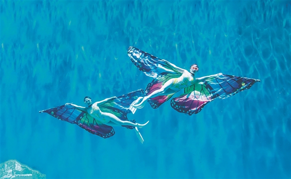 哈爾濱極地公園的水舞秀表演會聚國內(nèi)頂級水舞表演藝術(shù)家,汲取花樣游泳、芭蕾舞、形體藝術(shù)的精華。演員不僅需要克服6米深海水的巨大浮力,還要克服相當于陸地上12倍的巨大阻力,在0.5秒內(nèi)展開4米長的巨大蝴蝶羽翼,閉氣空潛3分鐘,完成一系列“蝶舞”動作,難度極高!炫彩的羽翼、波光粼粼的海水、五彩斑斕的魚兒融合在一起,美輪美奐。