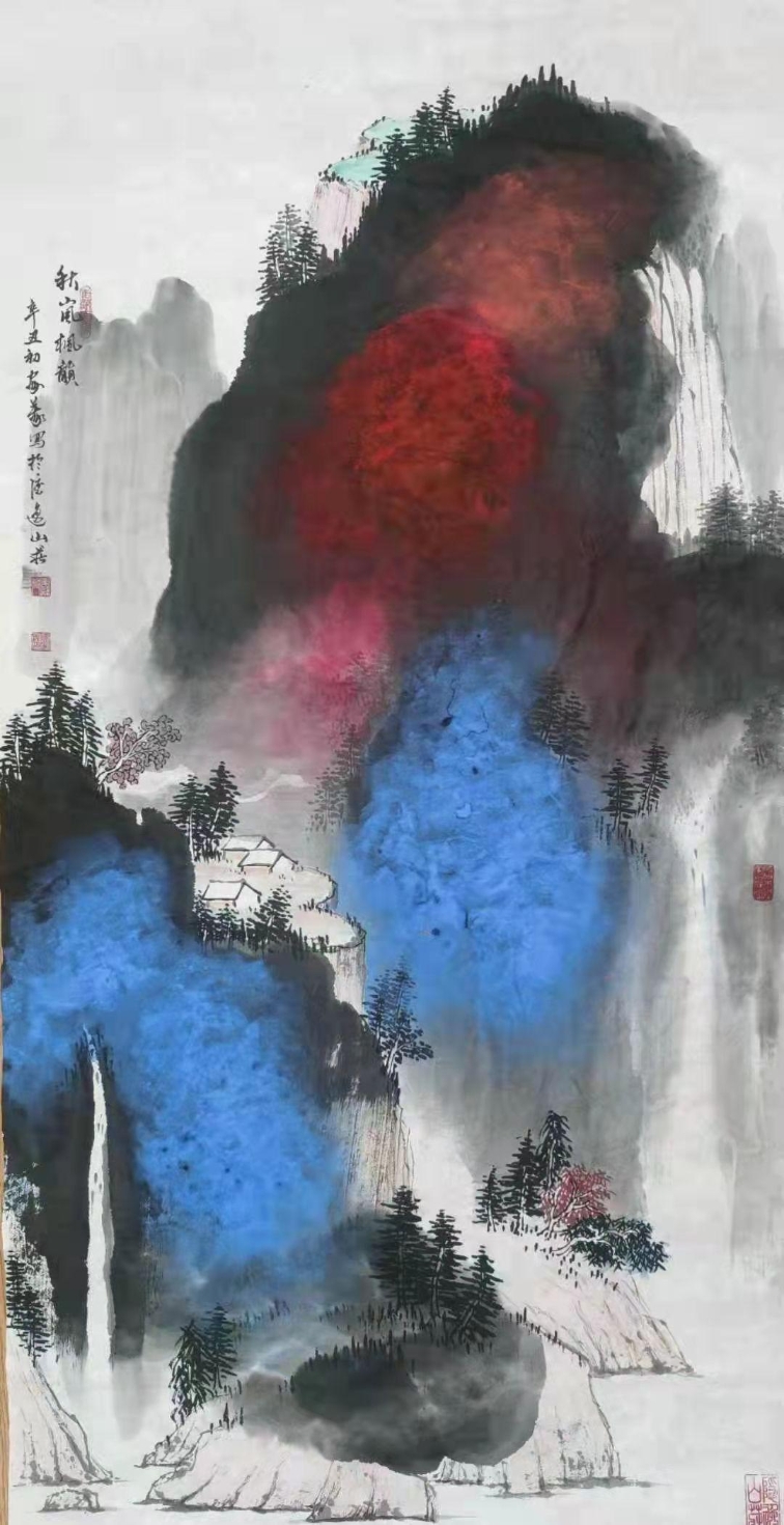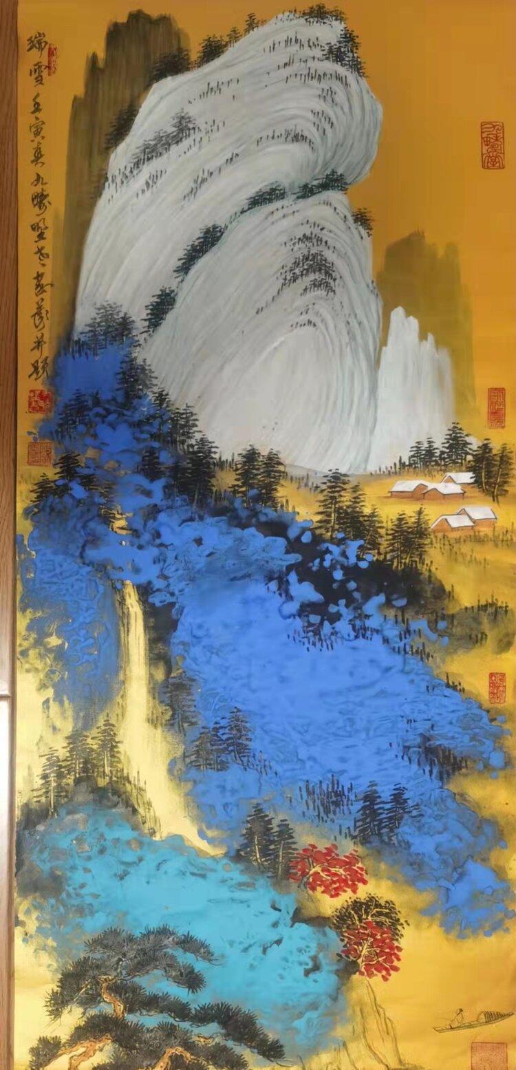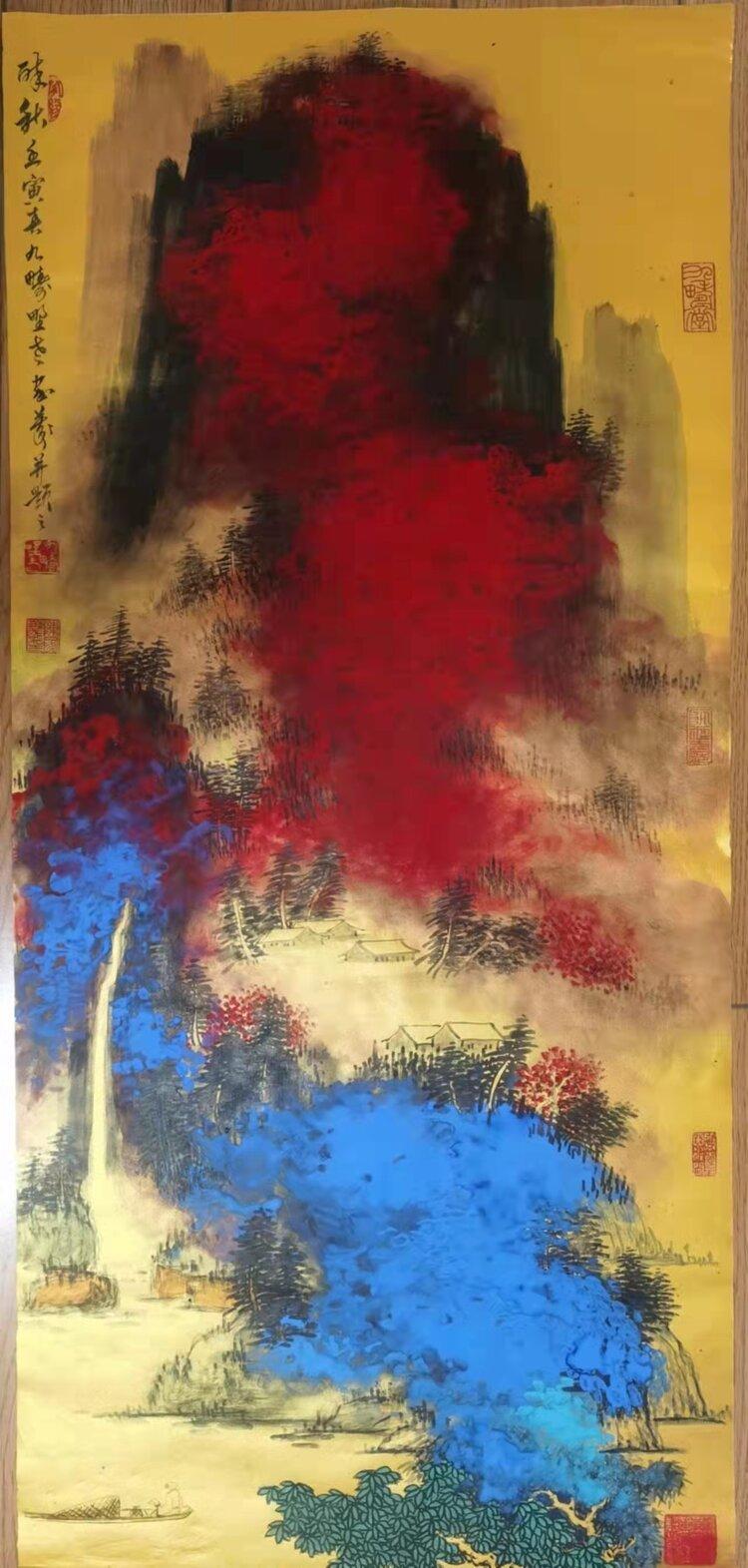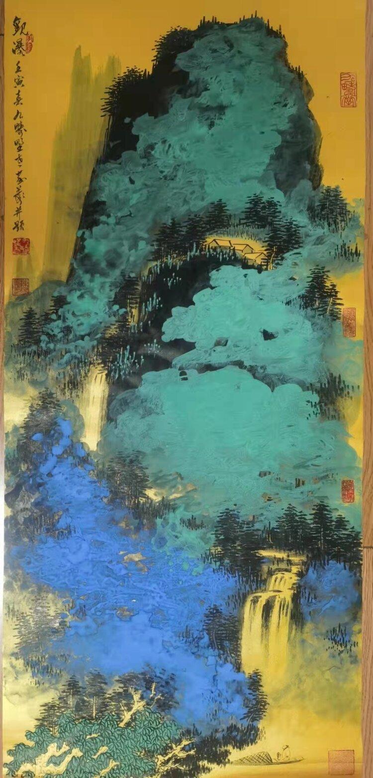 金箋畫是傳統(tǒng)繪畫的一種特有的形式,而彩墨作畫作為主要的方法和手段,其發(fā)展歷史久遠(yuǎn),金箋紙作畫給人以金碧輝煌、瑰麗富貴的形象,為人們所喜聞樂見。畫家在金箋紙上畫潑彩山水,更使之呈現(xiàn)出異樣的光彩。