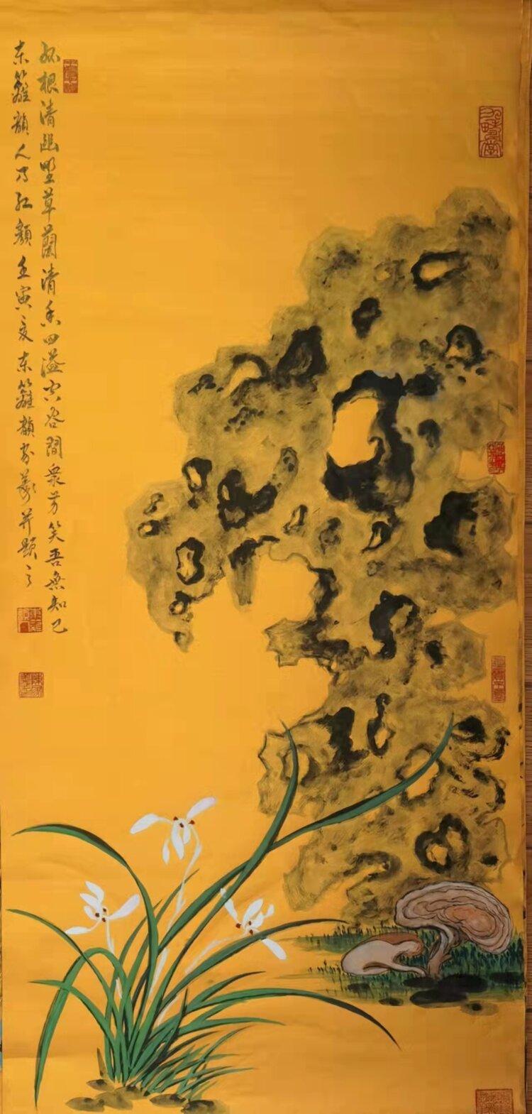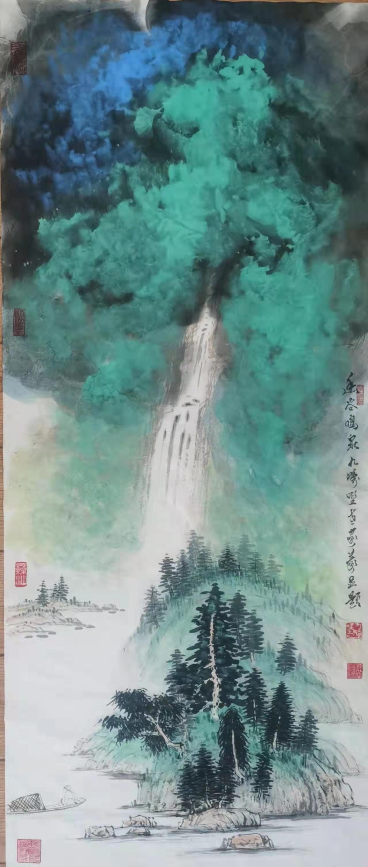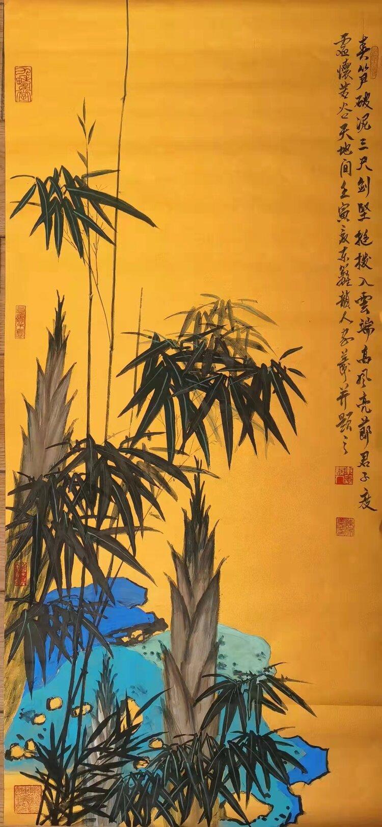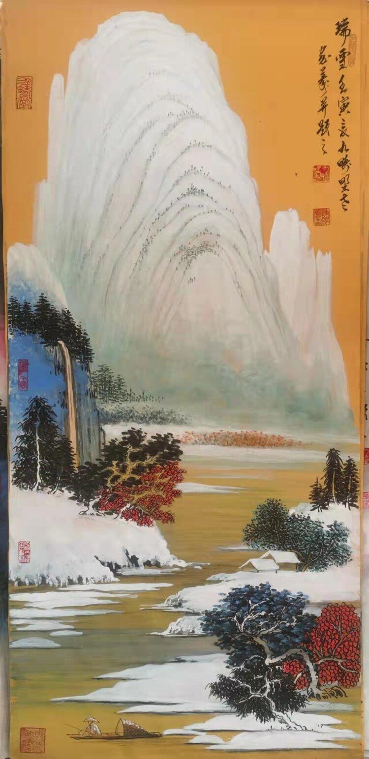 金箋畫是傳統(tǒng)繪畫的一種特有的形式,而彩墨作畫作為主要的方法和手段,其發(fā)展歷史久遠(yuǎn),金箋紙作畫給人以金碧輝煌、瑰麗富貴的形象,為人們所喜聞樂見。畫家在金箋紙上畫潑彩山水,更使之呈現(xiàn)出異樣的光彩。