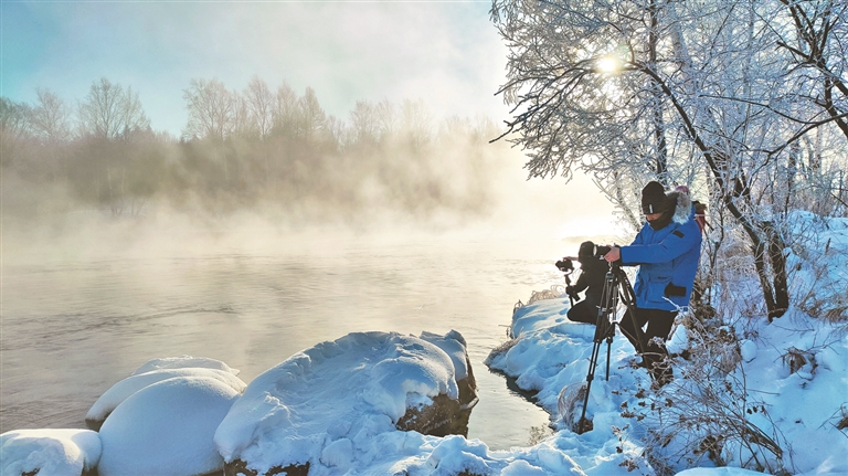 抬頭是凝霜掛雪的碧玉瓊枝,俯身是仙氣繚繞、終年不凍的庫爾濱河。這幾年,遜克大平臺霧凇景區(qū)聲名鵲起,每到冬季都能吸引一大批粉絲不遠(yuǎn)萬里而來。來自廣州市的游客王小雨說:“遜克大平臺的霧凇真的好漂亮,我已經(jīng)留意了幾年了,趁著2022年的年尾我終于趕過來看到了,比我想象中的還美!”同樣終年不凍的還有五大連池的溫泊,潔白的雪花覆蓋在黝黑的火山上,在天地間蕩漾開一幅水墨畫,游客可以邊泡溫泉邊賞雪。封凍的黑龍江遠(yuǎn)觀似一條玉帶,江面上也非常熱鬧,冬泳健將、滑冰健將各顯其能,江畔的冰雕雪雕賞心悅目。