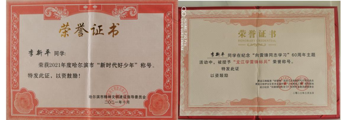 李新平同學(xué)就讀于呼蘭區(qū)建國(guó)小學(xué)五年五班,他勤奮好學(xué)、品學(xué)兼優(yōu)、樂觀向上、自強(qiáng)自立。從一年級(jí)開始就擔(dān)任班長(zhǎng)職務(wù),先后多次被評(píng)為三好學(xué)生、優(yōu)秀學(xué)生干部、優(yōu)秀少先隊(duì)員,榮獲2021年度哈爾濱市“新時(shí)代好少年”稱號(hào)、榮獲2021年第三屆龍江好少年活動(dòng)“龍江愛心大使”和“城市形象大使”,2022年被黑龍江省積善之家?guī)头鲋行那嗌倌曛驹刚呖傟?duì)授予“公益達(dá)人”稱號(hào),2023年在紀(jì)念“向雷鋒同志學(xué)習(xí)”60周年主題活動(dòng)中被韓振清學(xué)雷鋒創(chuàng)新工作室授予“龍江學(xué)雷鋒標(biāo)兵”榮譽(yù)稱號(hào)。在多類體育運(yùn)動(dòng)競(jìng)賽活動(dòng)中獲得等級(jí)證書及榮譽(yù)稱號(hào),出色的表現(xiàn)和真誠(chéng)的付出,贏得了大家的信任、同學(xué)們的信賴、家長(zhǎng)們的喜愛。