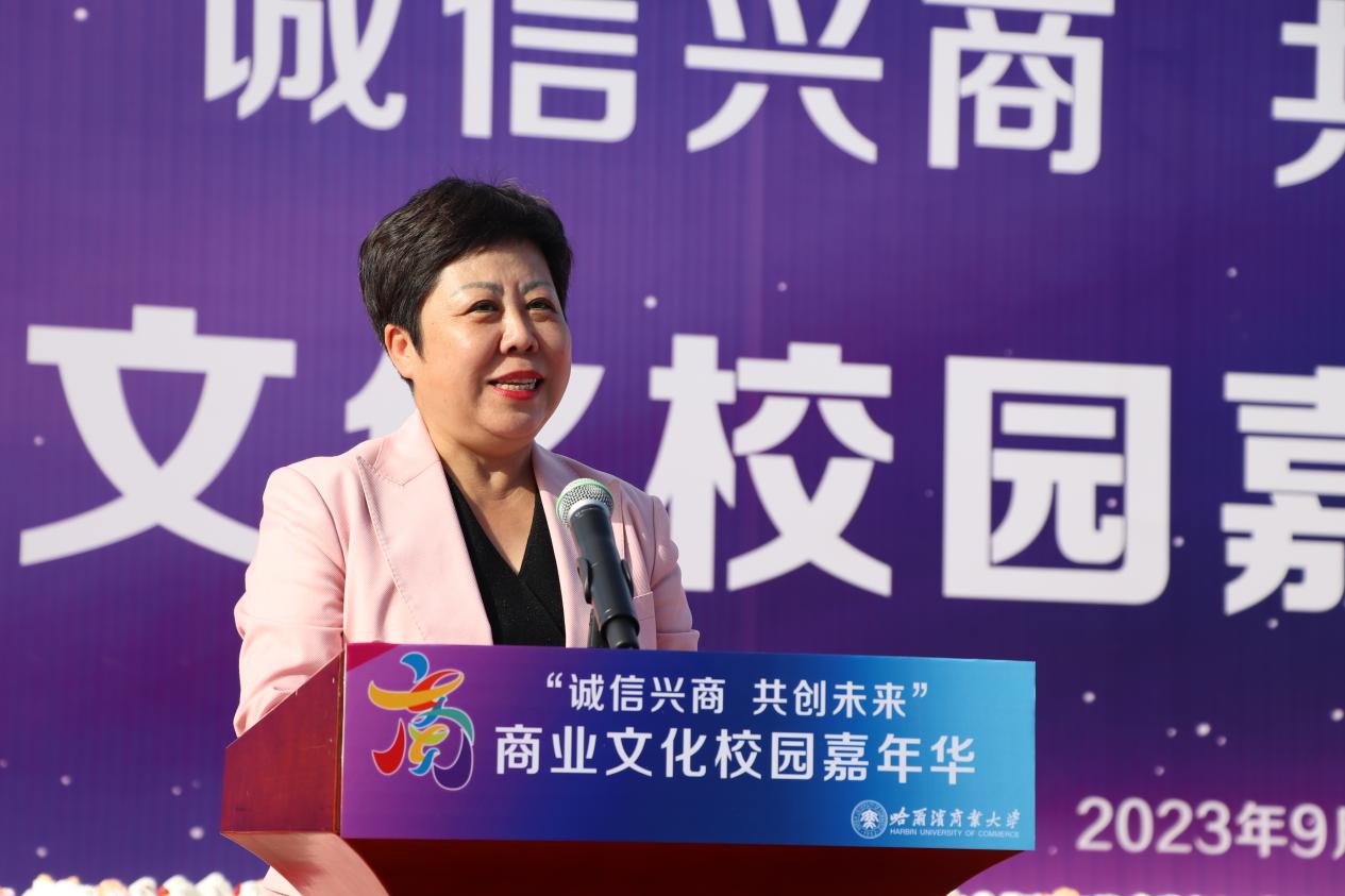 哈爾濱商業(yè)大學(xué)黨委書記孫先民致辭。他表示,誠信“軟實(shí)力”為高質(zhì)量發(fā)展提供“硬支撐”。本屆“誠信興商·共創(chuàng)未來”商業(yè)文化校園嘉年華活動堅(jiān)持以文化力量啟智潤心、固本培元,是深入學(xué)習(xí)貫徹習(xí)近平總書記在主持召開新時(shí)代推動?xùn)|北全面振興座談會和視察我省時(shí)的重要講話重要指示精神,全面落實(shí)立德樹人根本任務(wù)的務(wù)實(shí)舉措。哈爾濱商業(yè)大學(xué)作為新中國第一所多科性商業(yè)大學(xué),始終堅(jiān)持“大商鑄才、大雅育人、商雅兼?zhèn)?、?jīng)世濟(jì)民”的育人理念,厚植師生“心懷祖國,至誠奉獻(xiàn),以商弘業(yè),矢志一流”的大商之道?;顒訉⒊浞职l(fā)揮老字號在文化引領(lǐng)、品牌建設(shè)、產(chǎn)業(yè)升級等方面的示范引領(lǐng)作用,彰顯龍江市場主體活力與創(chuàng)新力,聚焦建設(shè)“六個(gè)龍江”、推進(jìn)“八個(gè)振興”,筑牢堅(jiān)定龍江文化繁榮發(fā)展的自信根基,進(jìn)一步凝聚師生扎根龍江、服務(wù)龍江、建設(shè)龍江的情懷和力量。