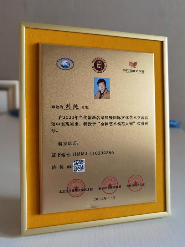 黑龍江經(jīng)濟(jì)網(wǎng)訊(記者王振紅 文/攝)日前,由北京當(dāng)代翰墨文化藝術(shù)院主辦的全國(guó)第五屆當(dāng)代翰墨名家展頒獎(jiǎng)盛典在北京圓滿結(jié)束。應(yīng)巴基斯坦駐華大使館邀請(qǐng),與會(huì)藝術(shù)家參加了中巴文化藝術(shù)交流并贈(zèng)送書畫作品。龍江著名美術(shù)家劉純獲大賽一等獎(jiǎng),被主辦單位與駐華使節(jié)商務(wù)聯(lián)盟(ECCAC)共同授予“全國(guó)藝術(shù)模范人物”榮譽(yù)稱號(hào)和中外國(guó)際文化交流大使。
