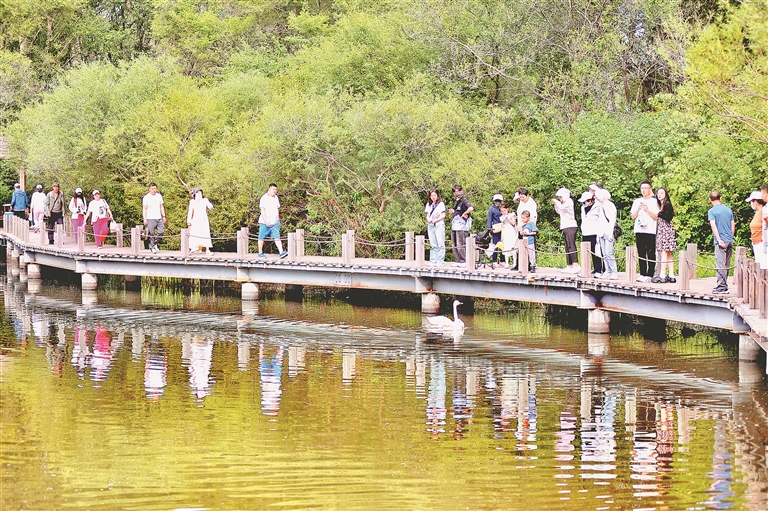 16日,陽光明媚,空氣清新,哈爾濱市迎來了好天氣。太陽島上,草木茂盛,百花爭艷,許多本地市民和南方游客組團來到這里避暑游玩。有的游人搭起帳篷野餐,有的游人走上濕地棧道觀賞美麗風景。孩子們玩過各種游樂項目后,再與小鹿、松鼠等小動物來個親密接觸。