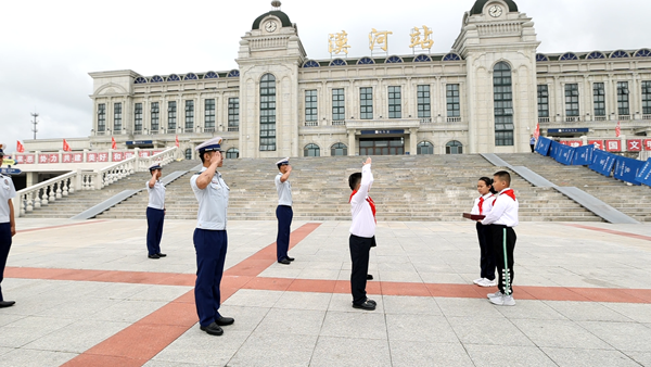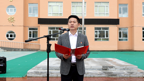 在國旗下,漠河市邊境檢查站代表陳澤和“全區(qū)十佳駐村干部”王成龍用自己生動(dòng)的故事為在場(chǎng)的每位少先隊(duì)員們上了一堂生動(dòng)的國防教育課,漠河市的少先隊(duì)員代表王涵在國旗下表達(dá)了對(duì)祖國的熱愛和對(duì)戍邊工作者們的敬佩。團(tuán)省委副書記陳海萍在講話中鼓勵(lì)少先隊(duì)員要學(xué)習(xí)漠河戍邊工作者們的堅(jiān)韌不拔和無私奉獻(xiàn),要立足祖國最北方志存高遠(yuǎn)、勤奮學(xué)習(xí)、錘煉品德、強(qiáng)健體魄,敢于創(chuàng)新、富于創(chuàng)意、樂于創(chuàng)造,要沿著“入隊(duì)、入團(tuán)、入黨”的“人生三部曲”奮力前進(jìn),為推進(jìn)中國式現(xiàn)代化、實(shí)現(xiàn)強(qiáng)國復(fù)興偉業(yè)貢獻(xiàn)青春力量。