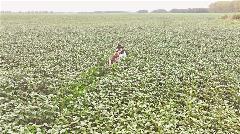 26日,在北大荒農(nóng)業(yè)股份二九〇分公司一片大豆田中,種植戶戎立國正在查看作物長勢(shì)。表面望去,這片田地與普通大豆無異,這里實(shí)際種植的,是特色黑豆品種。