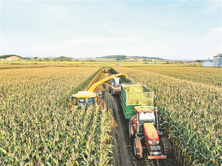 青貯玉米是八五一一農(nóng)場有限公司2.4萬頭奶牛越冬的重要口糧。經(jīng)過切碎、加工后,發(fā)酵制作成青貯飼料的玉米干物質(zhì)淀粉含量高、營養(yǎng)好,是公認(rèn)的優(yōu)質(zhì)飼料。青貯玉米既為奶牛提供了優(yōu)質(zhì)口糧,又減少了因焚燒玉米秸稈帶來的環(huán)境污染,為各牧場增收奠定了基礎(chǔ),更實(shí)現(xiàn)了畜牧業(yè)綠色低碳高質(zhì)量發(fā)展。