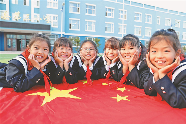 呼瑪縣第二、第三小學(xué)的孩子們和國旗合影。本報記者 郭俊峰攝