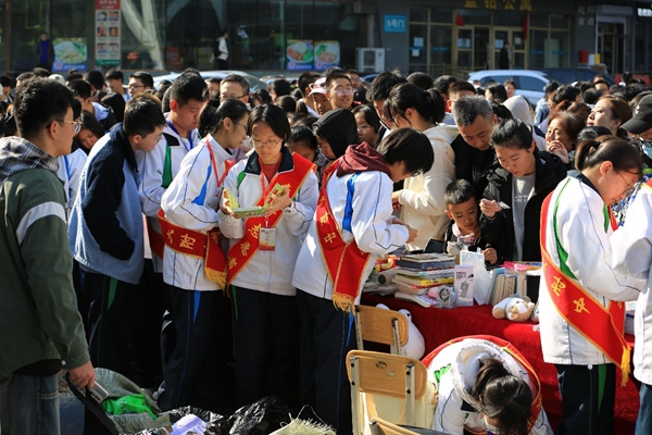 10月13日9:30時(shí),義賣會(huì)正式開幕。出席開幕式的嘉賓有:黑龍江省希望工程捐助中心主任杜晶,哈師大附中黨委書記張靜萍、哈師大附中校長(zhǎng)劉振成、哈師大附中副校長(zhǎng)秦毅,黑龍江省實(shí)驗(yàn)中學(xué)團(tuán)委書記韓宇,哈19中團(tuán)委書記張綰,工大附中初中部團(tuán)委書記耿冬穎,哈師大附中學(xué)生處主任劉治軍、副主任陳明濤。哈師大附中團(tuán)委書記唐丹丹首先介紹了附中志愿活動(dòng)的歷史和本次義賣的意義,并向哈爾濱師范大學(xué)、哈爾濱工程大學(xué)、黑龍江省實(shí)驗(yàn)中學(xué)、哈爾濱市第十九中學(xué)、哈工大附屬中學(xué)初中部、哈爾濱市閩江小學(xué)、哈爾濱市青年宮少年新聞學(xué)院、哈爾濱學(xué)府凱德團(tuán)隊(duì)等義賣團(tuán)隊(duì)成員和聞?dòng)嵹s來的學(xué)生、家長(zhǎng)、市民、商場(chǎng)顧客們表示歡迎和感謝。