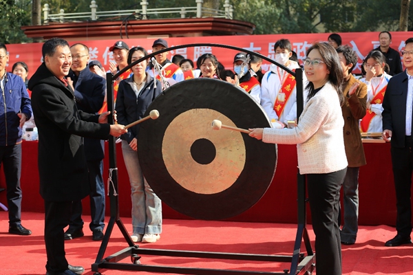隨后黑龍江省希望工程捐助中心杜晶主任和哈師大附中校長(zhǎng)劉振成一同鳴響大鑼,鑼聲響徹整個(gè)凱德廣場(chǎng),劉校長(zhǎng)宣布義賣會(huì)正式開始。