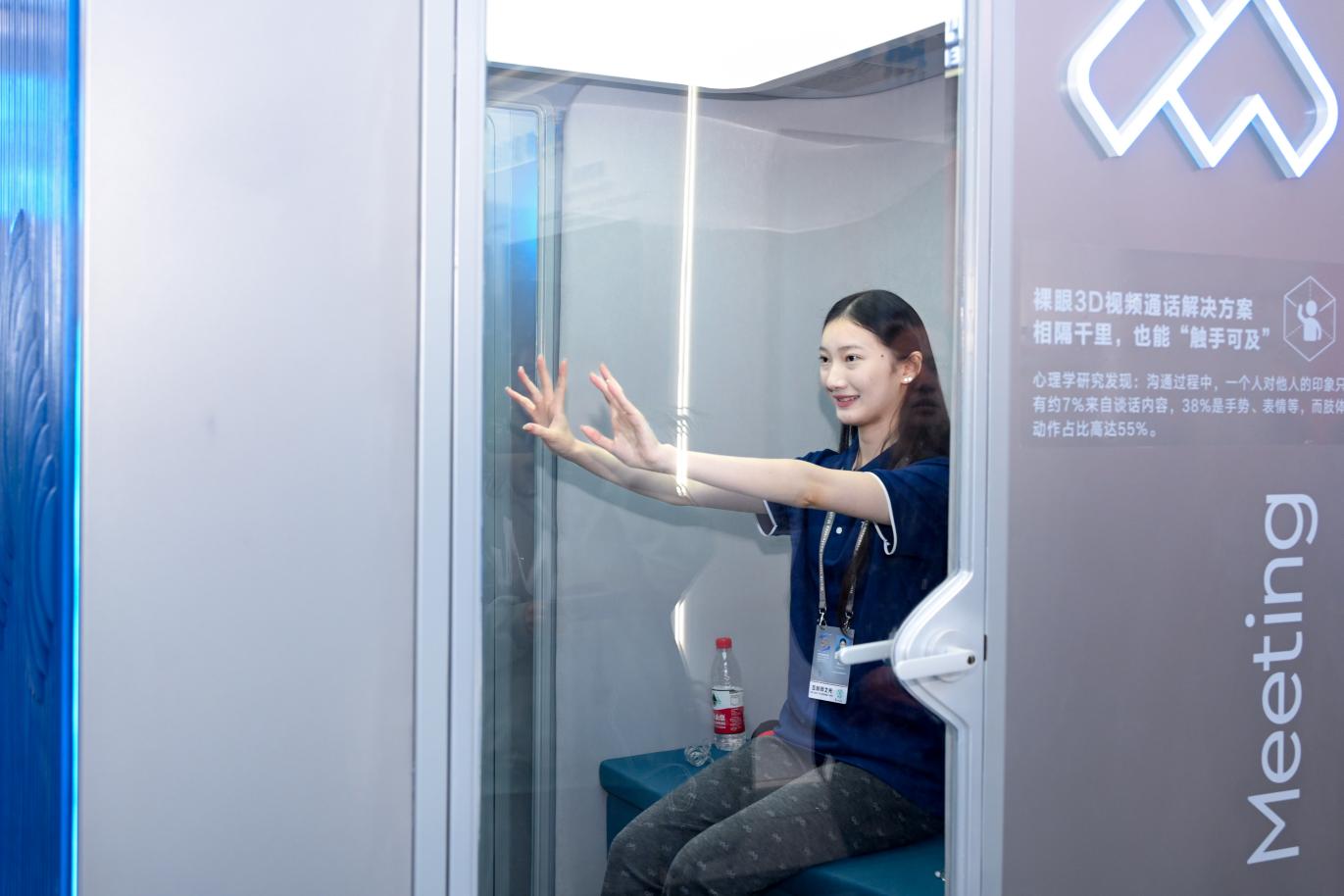圖為參觀者體驗(yàn)騰訊會議裸眼3D通話艙