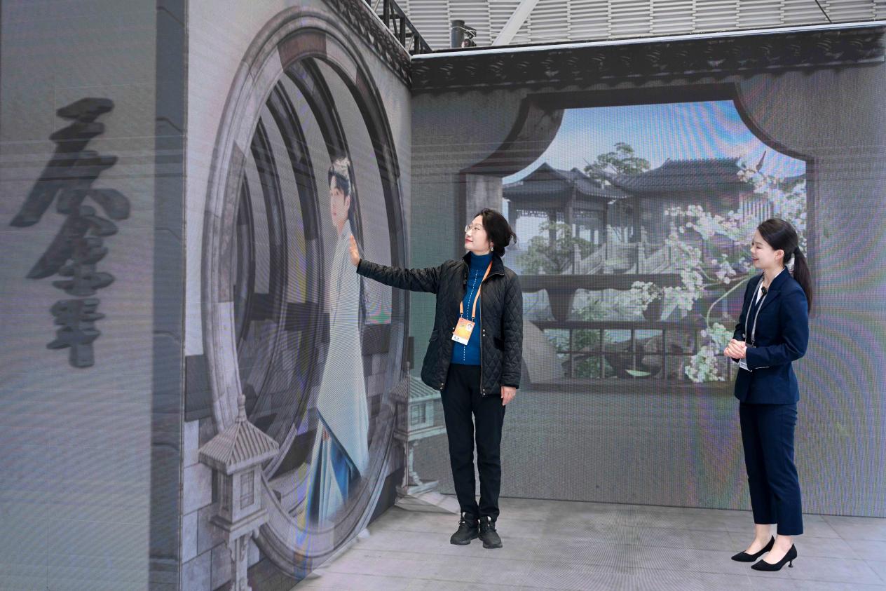 文化板塊,是騰訊本次展會的一大亮點(diǎn)。在“騰訊文化IP盒子”中,集合騰訊文學(xué)、影視、音樂、游戲、電競、動漫六大板塊的文化產(chǎn)業(yè)集群躍然眼前。在以裸眼3D模式呈現(xiàn)的三面屏中,觀眾可以一覽騰訊文化產(chǎn)業(yè)的全球布局,走入《慶余年》《繁花》等IP經(jīng)典場景中進(jìn)行合影,并通過現(xiàn)場設(shè)置的AI智能體,與劇中的虛擬角色實(shí)時語音互動。