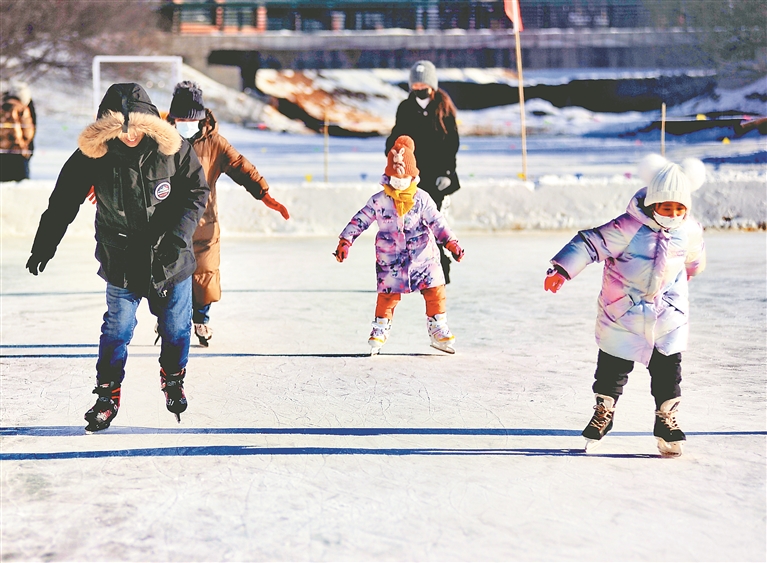 近日,哈爾濱市道里區(qū)群力體育公園公益冰場內(nèi),許多人在練習(xí)滑冰。