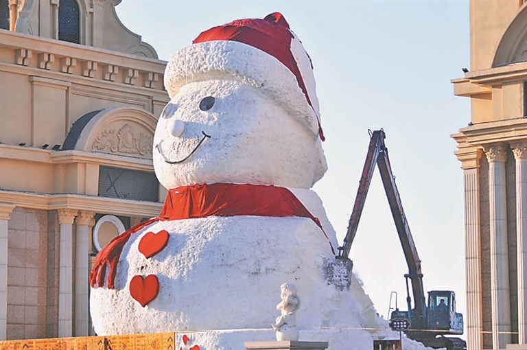 本報24日訊(記者 馬智博)24日,位于哈爾濱市道里區(qū)群力音樂公園的“網(wǎng)紅大雪人”開啟“年假模式”,再次與市民、游客說“再見”。