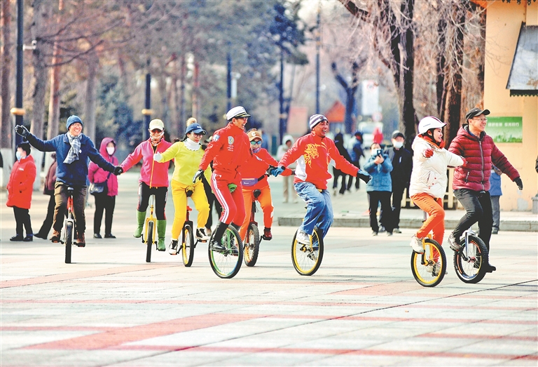 在哈爾濱市江畔斯大林公園內(nèi)的小廣場上,許多人在練習(xí)騎獨輪車。在樹林旁,數(shù)十位老年人在跳民族舞。公園的人行道上,不時有成群的徒步者走過。