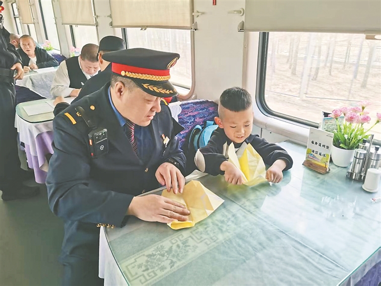 本報訊(張蔚萌 王夢 記者 王迪)近日,由鄭州開往海拉爾的K927次列車從昌圖站駛出后,列車長孫志強接到12306轉(zhuǎn)發(fā)的緊急尋人求助工單。經(jīng)過與客服溝通了解后得知,旅客劉玲玲帶6歲兒子劉俊澤從沈陽北站乘車至昌圖站,因下車時忙于整理行李,將座位上熟睡的孩子遺落在列車上。列車長孫志強通過對講機立即組織各節(jié)車廂列車員尋找孩子,確定孩子位置后迅速趕到現(xiàn)場。為了緩解孩子的緊張情緒,他化身“臨時爸爸”,將孩子帶到了餐車,不僅準備了一些自帶的小零食,還陪孩子一起折紙飛機。當列車??块L春站后,孫志強按照其母親劉玲玲的要求,將孩子安全移交給長春站工作人員,等待其家屬前來接領(lǐng)。