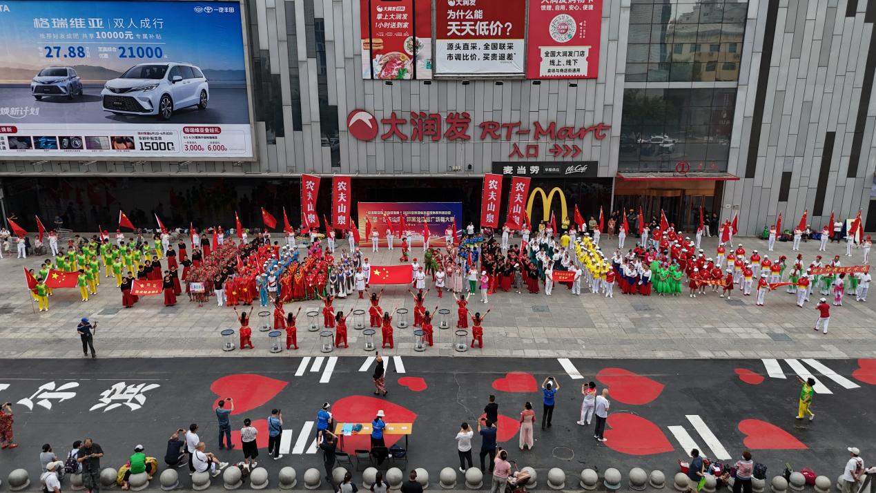 30人鼓樂團(tuán)方陣,精神飽滿閃亮登場,瞬間點(diǎn)燃現(xiàn)場氣氛;隨后身穿紅色T恤的百人舞團(tuán),臺上臺下同跳《丁香花》,優(yōu)美舞姿展現(xiàn)出濃郁地域文化特色……