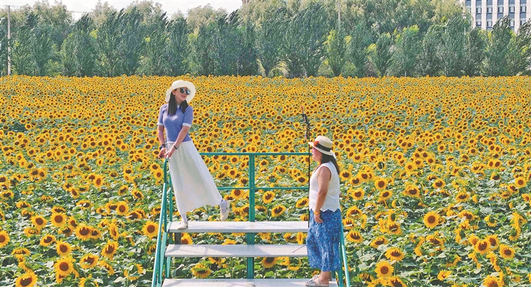 近日,哈爾濱市東方學(xué)院的校園里,30萬株向日葵進(jìn)入盛花期,層層疊疊的金黃花瓣在校園里組成金色矩陣,連蜂蝶振翅都沾滿蜜糖色的光斑。風(fēng)掠過時,葉片翻卷出翡翠色的浪涌,花盤碰撞發(fā)出細(xì)雨般的窸窣聲,空氣里浮動著類似烤面包的溫暖香氣。花海間的小橋上,愛花的市民在這里打卡拍照,定格最美瞬間。