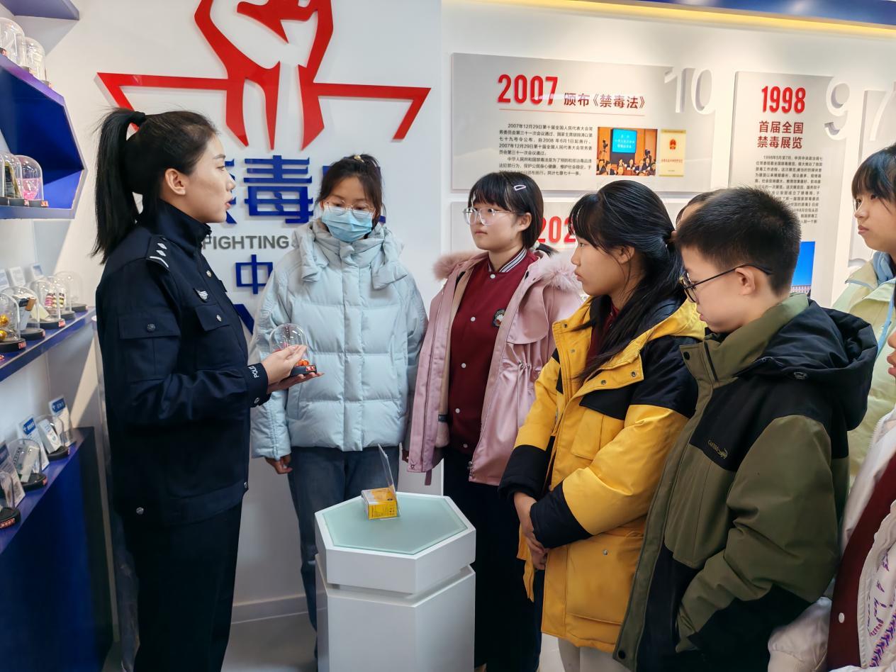 活動(dòng)中,在基地講解員的引導(dǎo)下,師生們?cè)谥袊?guó)禁毒史展區(qū),虎門銷煙的歷史場(chǎng)景、近代禁毒斗爭(zhēng)通過圖文形式生動(dòng)呈現(xiàn),講解員講述的禁毒先輩故事,讓師生們深刻感悟到禁毒工作的歷史厚重與現(xiàn)實(shí)意義。在仿真毒品展示區(qū),講解員詳細(xì)介紹了傳統(tǒng)毒品、合成毒品及新型毒品的種類、特性與識(shí)別技巧,破解了“看似無害實(shí)則致命”的毒魔偽裝,幫助師生們練就辨別毒品的“火眼金睛”。