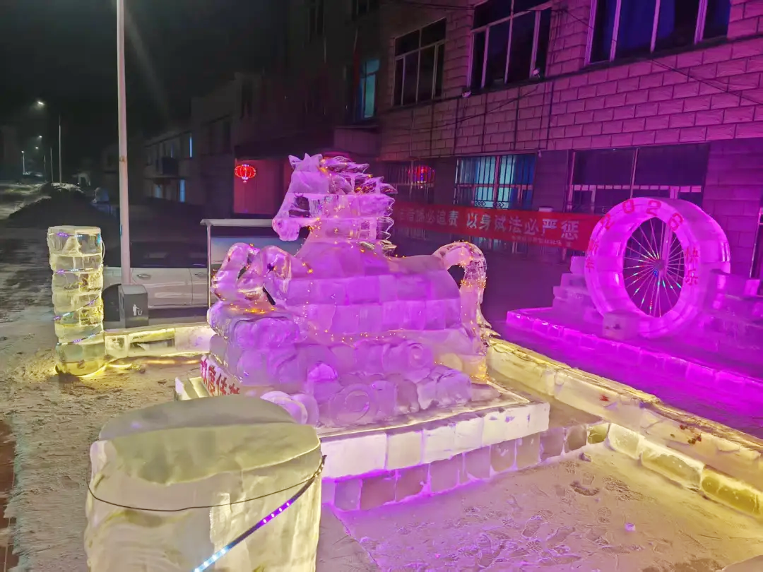 活動現(xiàn)場,專業(yè)技術(shù)工人憑借精湛技藝,專注勾勒駿馬整體輪廓,對眼部、鬃毛等關(guān)鍵部位精雕細琢,力求每一處細節(jié)都精準靈動;林場干部職工則主動扛起取冰、補冰、轉(zhuǎn)運等“硬核”任務(wù),大家分工明確、默契配合,叮叮當當?shù)墓ぞ咔脫袈?、此起彼伏的互助吆喝聲,交織成冬日里最熱鬧的樂章。經(jīng)過十余天的奮戰(zhàn),一尊尊栩栩如生的冰雕驚艷亮相,并成為林場及周邊區(qū)域的“新春網(wǎng)紅地標”,不少職工家屬、周邊群眾紛紛慕名而來,拍照打卡、定格年味瞬間,歡聲笑語為林場增添了更多溫馨氛圍。