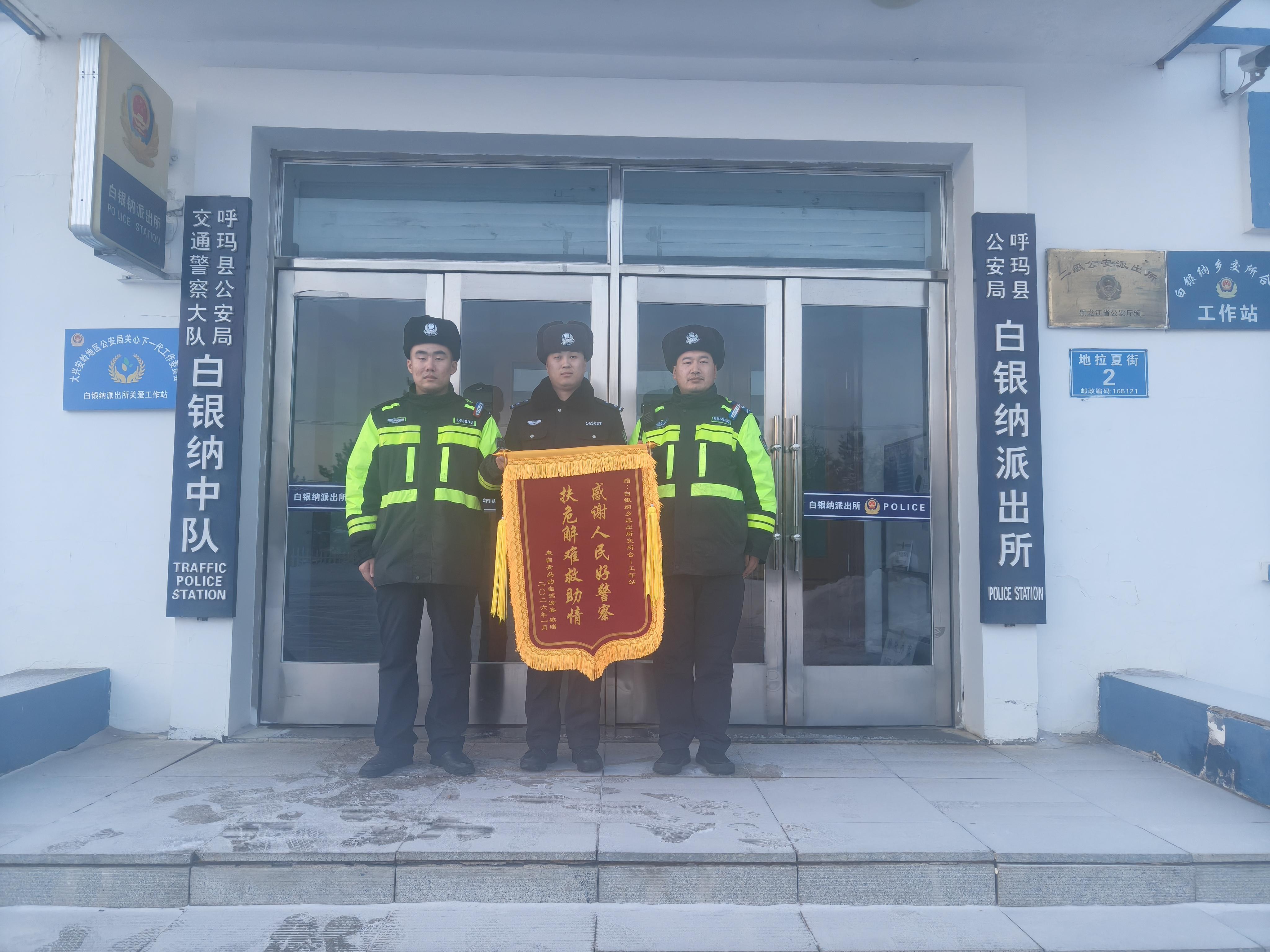 雖已時(shí)隔多日,游客仍銘記著那個(gè)寒夜里感受到的警察溫度和擔(dān)當(dāng),特意定制錦旗,跨越千里寄送至呼瑪縣公安局白銀納派出所,以表深深謝意。
