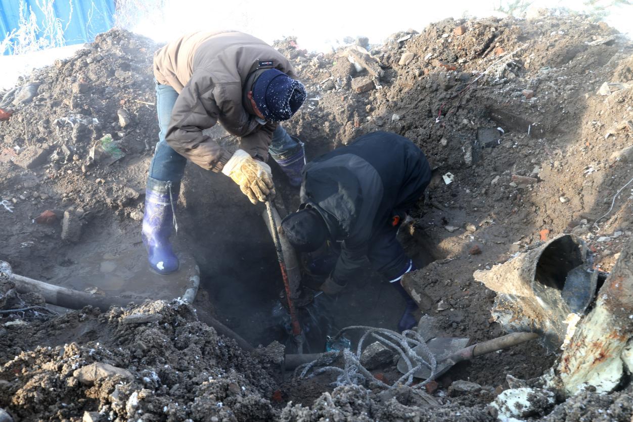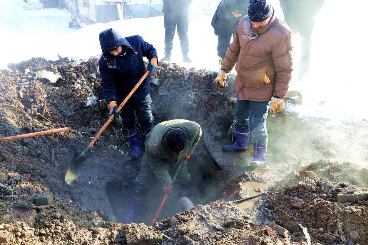 因地下管線錯綜復雜,且極寒天氣易導致管道凍裂,搶修人員采取邊供暖、邊排水、邊人工開挖的方式推進作業(yè),防止管線被凍擴大輻射面。地面破開后熱水持續(xù)涌出,搶修人員輪番上陣,清理凍土、排查漏點,歷經(jīng)3小時奮戰(zhàn),至11時40分挖出1.8立方米深坑,精準定位漏點為供暖分線軟接頭老化,此時跑水量已達每小時4噸。為控制漏損,搶修人員當即關閉分線閥門,受此影響,周邊20余戶居民供暖暫時中斷。