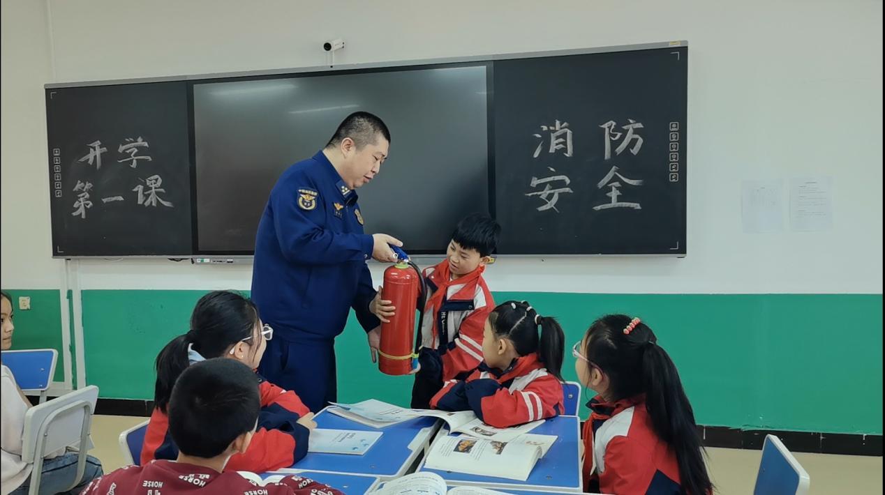 消防宣傳員在課堂上講解《中小學(xué)生消防安全讀本》中的消防安全常識(胡春磊 攝)